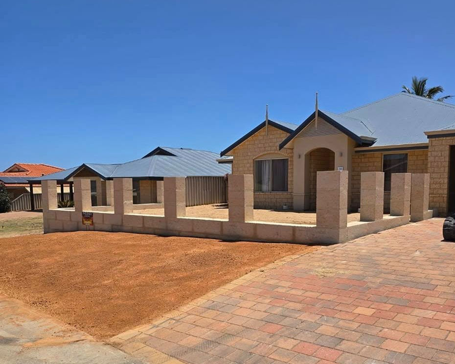 80m limestone wall from 1m blocks, 2 blocks high with piers and two driveway aprons. Set on concrete footings this wall is built to last.